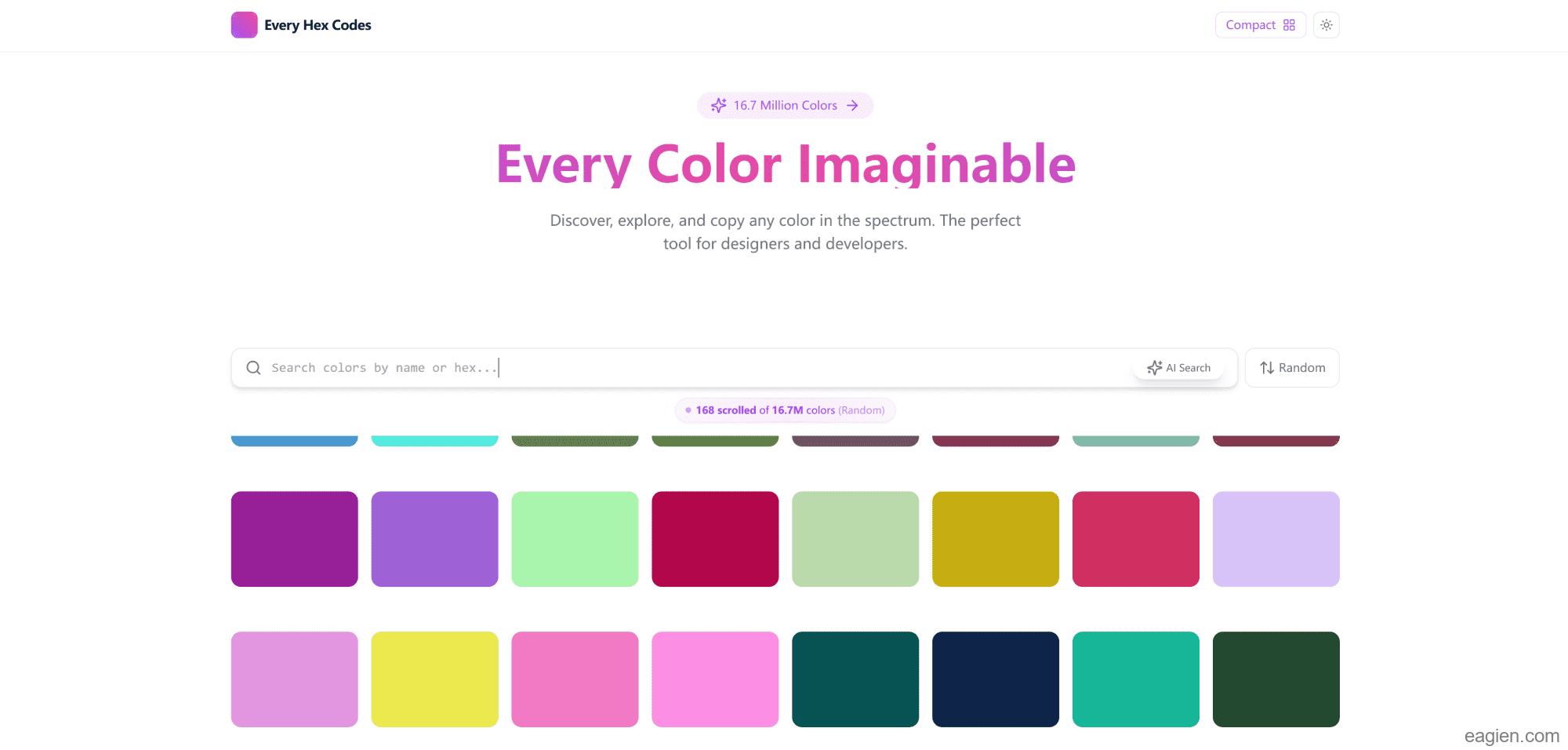 Every Hex Codes是一个专注于颜色展示的在线工具,它以独特的方式呈现了整个十六进制颜色空间中的所有颜色。网站采用了极简的设计理念,通过紧凑的布局展示了超过1670万种颜色,每个颜色块都清晰地标注了其对应的十六进制代码,让用户能够直观地浏览和选择。