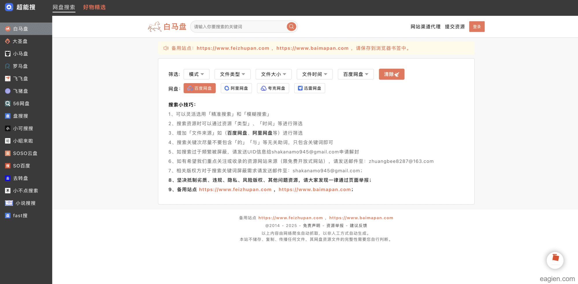 超能搜是一个专业的网盘资源导航平台,成立于2019年,拥有完整的ICP备案资质。该平台整合了多个主流网盘搜索引擎,包括白马盘、大圣盘、小马盘、罗马盘等知名搜索引擎,同时还收录了飞飞盘、飞猪盘等特色网盘搜索工具。平台界面简洁清晰,用户可以根据自己的需求快速选择合适的搜索引擎,提高资源查找效率。