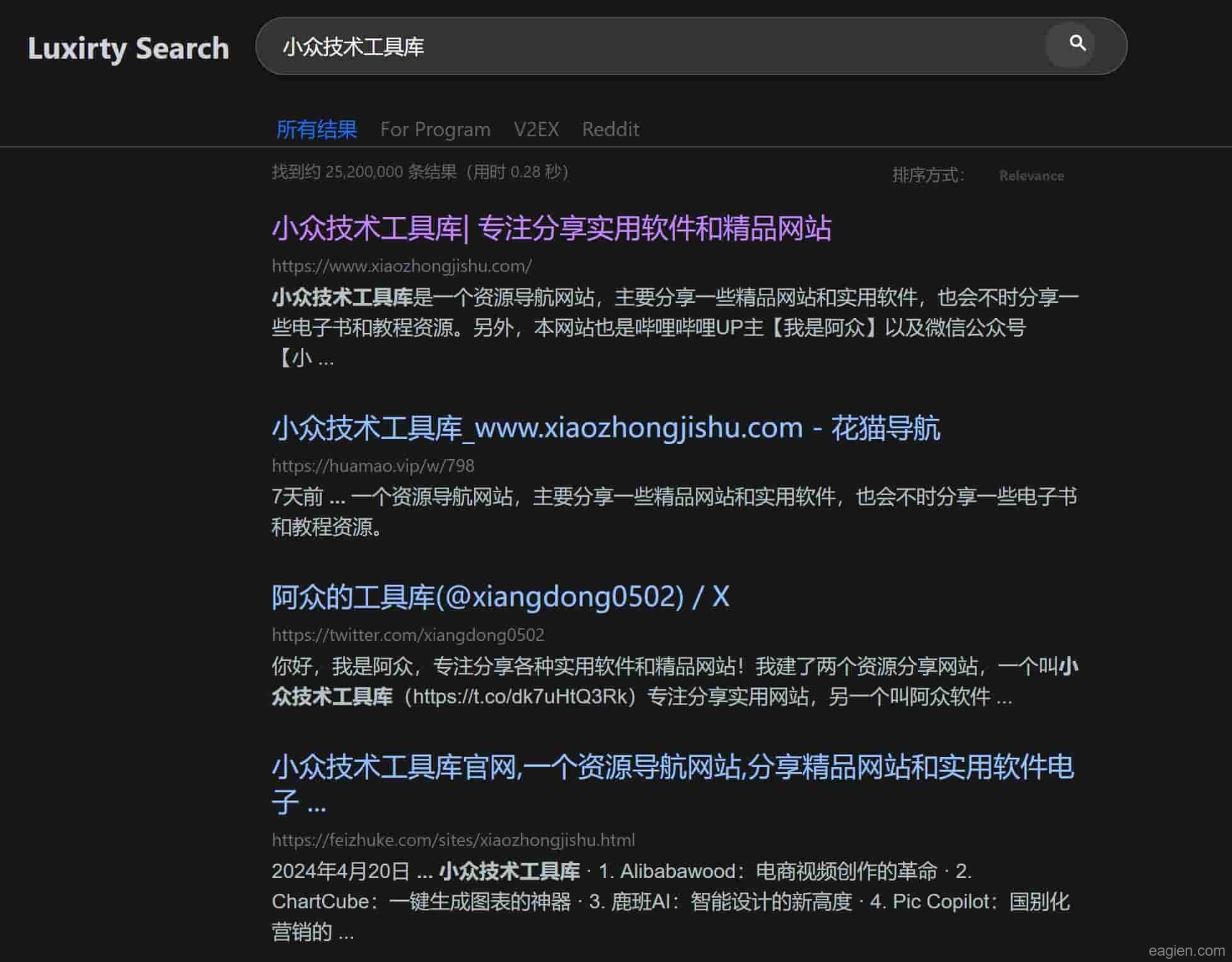 For Program,用户可以一键提高 GitHub、Stackoverflow、v2ex、cnblog 等技术社区的搜索结果权重,免去手动输入 site: 的麻烦。 - 一键搜索 v2ex:用户可以直接通过 Luxirty Search 搜索 v2ex 社区的内容,方便快捷。