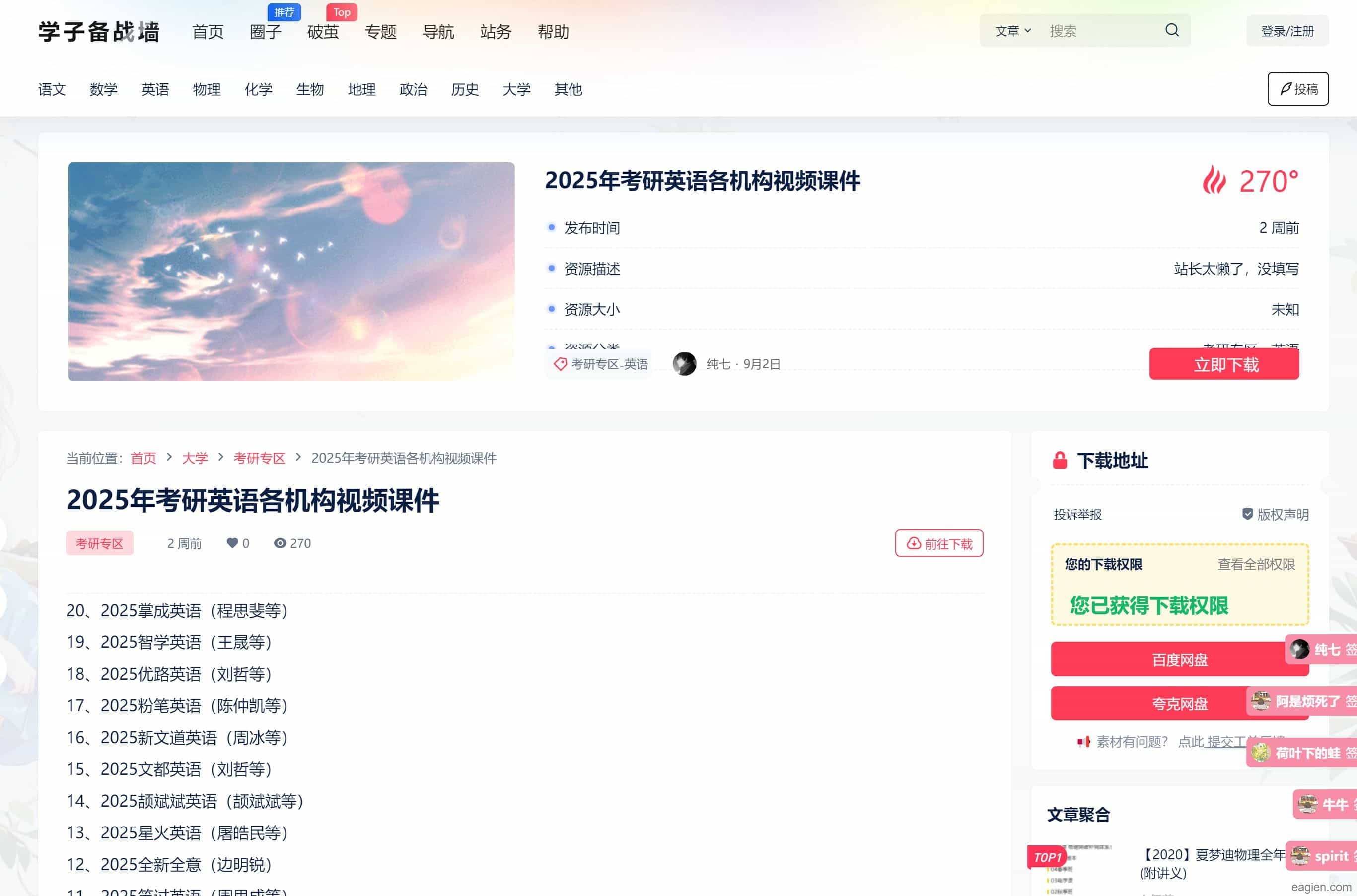 顶部菜单已经按照学科种类进行了筛选,就拿英语来说吧,目前英语相关资源共有324套,今天还上传了4套,中小学、考研英语、四六级英语全都有!