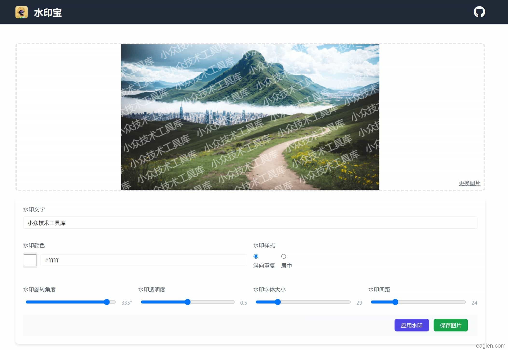 水印宝是一款免费开源的图片水印在线添加工具网站,使用它你可以为你的图片添加文字水印,并且可以按照自己的需求,调整水印的样式和大小。