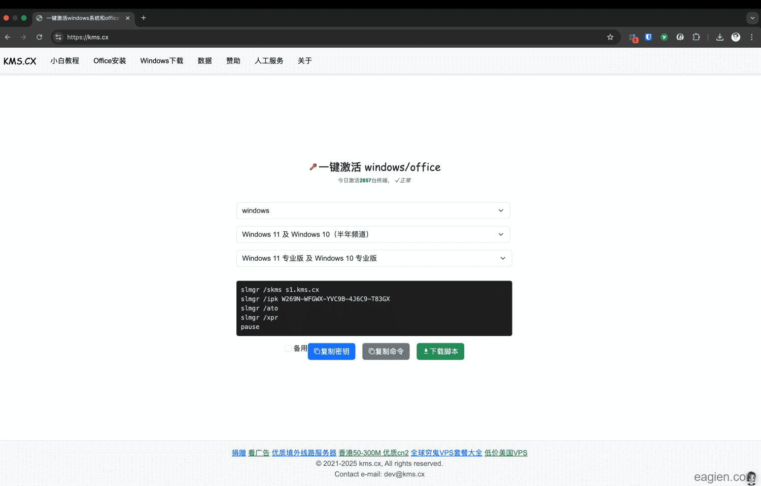 KMS.CX是一个提供免费KMS激活服务的网站,专为Windows和Office产品设计,基于Microsoft的批量许可证系统(GVLK)。它允许用户通过简单脚本一键激活软件,激活有效期最长180天,需保持网络连接以自动续期。网站旨在为广大网友提供安全、稳定且不收费的技术支持,仅用于技术交流学习,不支持企业或生产环境。服务包括复制密钥、下载脚本和实时激活统计,帮助用户快速完成软件激活过程。