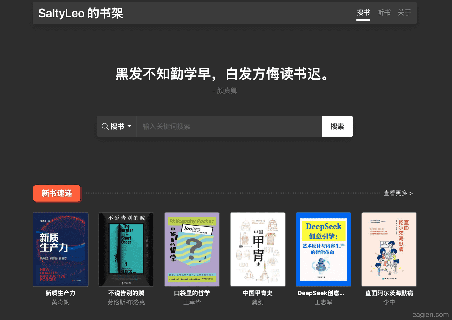 SaltyLeo的书架(https://book.tstrs.me/ )是一个电子书聚合搜索引擎,专注于整合全网免费电子书资源。它通过聚合ManyBooks、书葵网、古腾堡等平台资源,提供一站式检索服务,用户可快速搜索数以十万计的电子书,涵盖EPUB、AZW3、MOBI等多种格式。平台本身不存储资源,而是跳转至对应站点下载,简化了用户跨平台查找的流程。