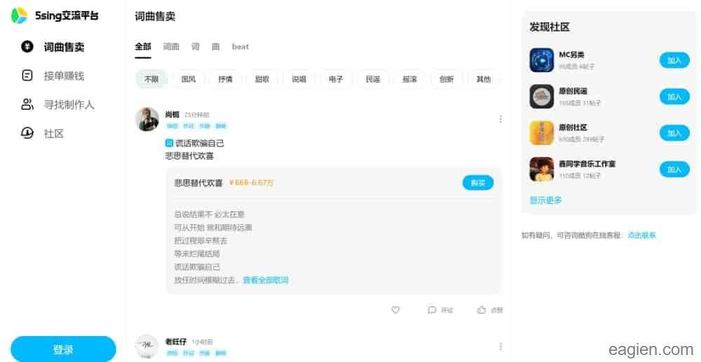另外,酷狗也创建了一个5Sing交流平台,你可以在这里进行歌词售卖、接单赚钱、寻找制作人,还由一个可以发帖交流的社区!
